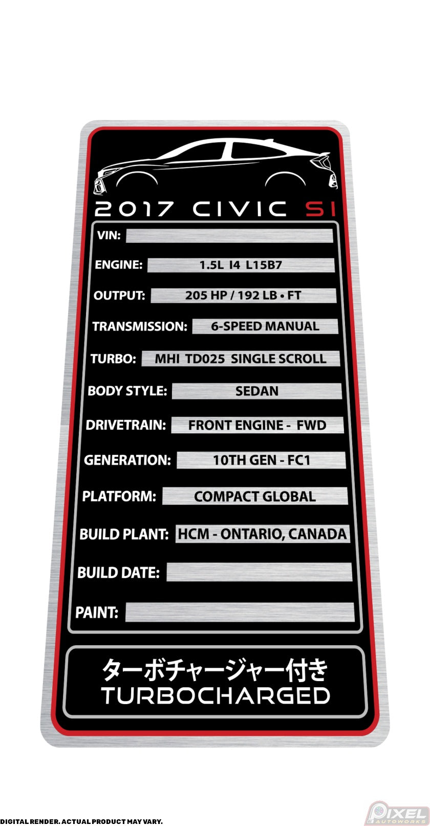 2017 HONDA CIVIC SI SEDAN Engine Bay Build Plaque
